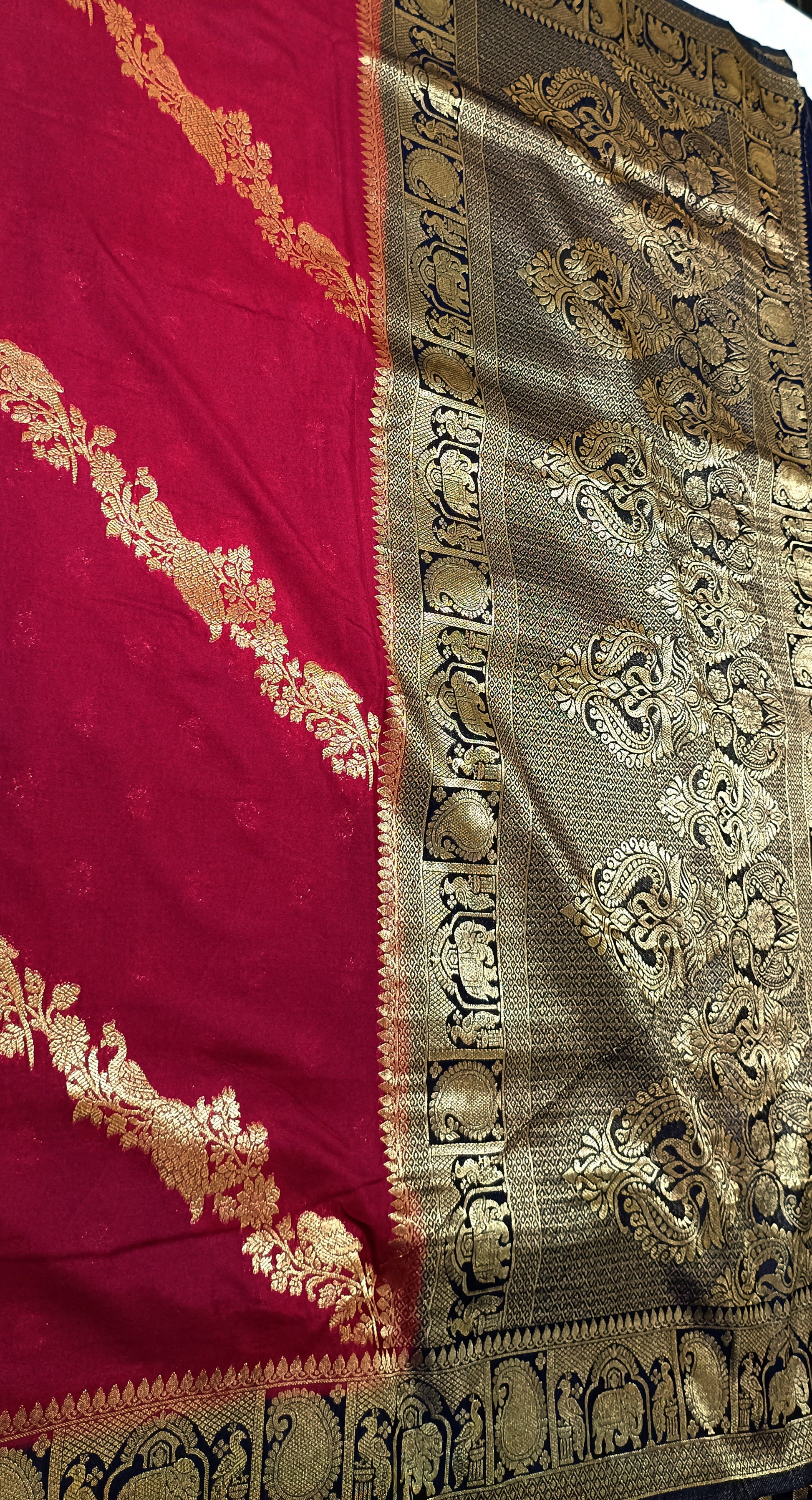 Chanderi Crepe silk saree in thick Maroon colour with navi blue boarder 6.30 cut including blouse .Parrots and peacock zari woven cross lines. very very elegant and super look smooth and light weight. Zari woven butta blouse with boarder colour